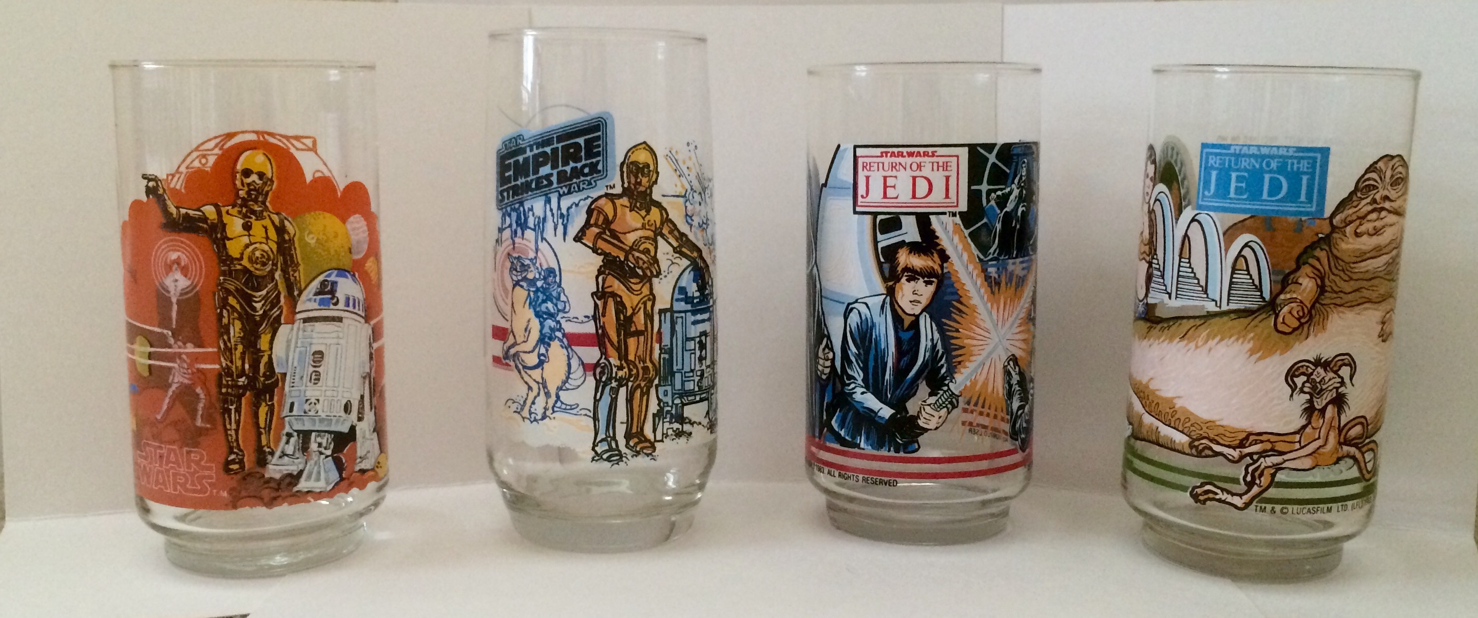 My siblings and I used to fight over who got to use what glass. We had two of the same from Star Wars with R2-D2 and C-3PO on them (my favorite), one from The Empire Strikes Back, also with R2 and 3PO, and two from Return of the Jedi, one with Luke Skywalker and Darth Vader and the other with Jabba the Hut and Princess Leia. Sadly, one of the two Star Wars glasses has broken, but the others are still getting good use today in our kitchen.